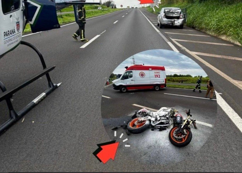 Um grave acidente foi registrado na tarde deste último domingo (22) na BR-376, nas proximidades da praça de pedágio entre Mandaguaçu e Presidente Castelo Branco, na região. A ocorrência envolveu uma motocicleta de alta cilindrada e um automóvel.