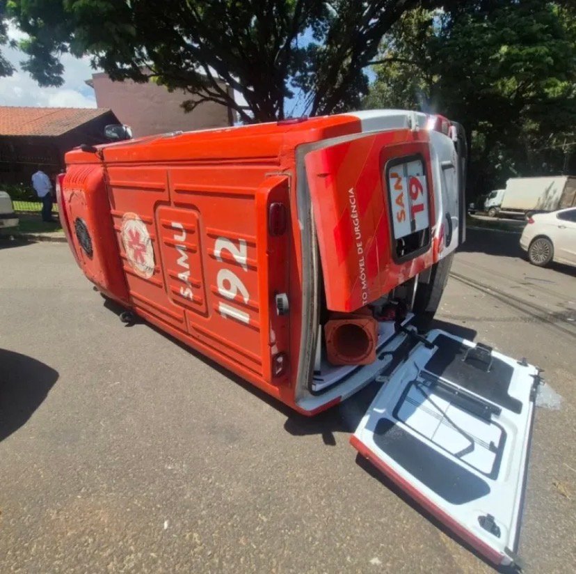 Uma ambulância do Serviço de Atendimento Móvel de Urgência (Samu) tombou após se envolver em um acidente de trânsito na tarde desta última sexta-feira (6), no cruzamento da Avenida Doutor Luiz Teixeira Mendes com a Rua Ermelindo de Leão, na Zona 5, em Maringá.