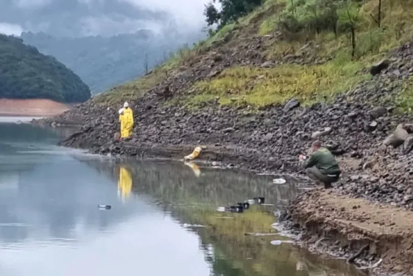 Imagens registradas no local mostram a água da represa com coloração alterada em vários pontos, consequência do vazamento da carga. Segundo o Corpo de Bombeiros, o trabalho de contenção começou ainda durante a madrugada, com o uso de mantas absorventes para evitar a dispersão do material.