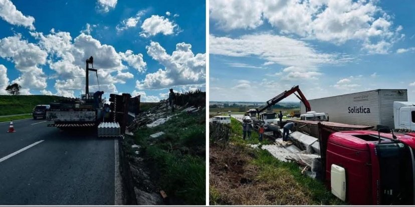 Um caminhão que transportava telhas de doação para os municípios de Sabáudia e Pitangueiras tombou no quilômetro 6 da PR-986.