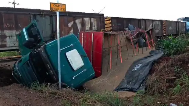 Uma carreta carregada com trigo foi partida ao meio após ser atingida por um trem na manhã desta segunda-feira (19), em um cruzamento ferroviário de Cambé, no norte do Paraná. Com a força do impacto, cerca de 38 toneladas do grão ficaram espalhadas pela via, provocando transtornos no tráfego da região.