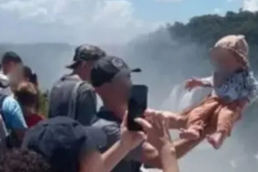 A imagem mostra um homem erguendo um bebê acima da grade de proteção do mirante, ultrapassando deliberadamente a barreira instalada para evitar acidentes graves. A atitude causou apreensão imediata entre pessoas que estavam na passarela, diante do risco evidente imposto pela altura das quedas e pela força das águas.