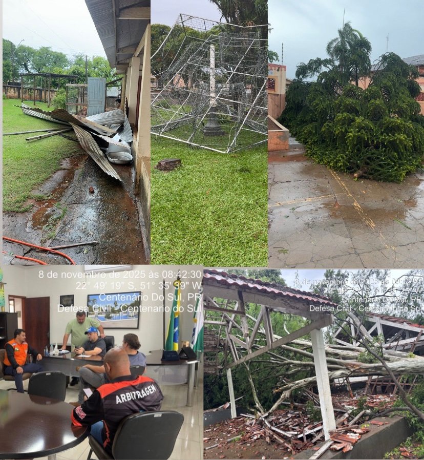 A Defesa Civil de Centenário do Sul trabalha desde as 20h de ontem (7) para atender as ocorrências provocadas pelo temporal que atingiu o município. A equipe atua em conjunto com a Prefeitura, servidores municipais, munícipes e vereadores, que auxiliam na distribuição de lonas para proteger móveis e residências afetadas.