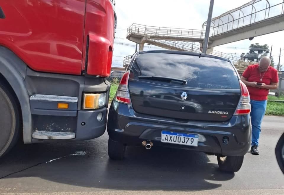 Uma colisão entre um caminhão Scania e um Renault Sandero foi registrada na tarde desta segunda-feira (3) na BR-369, nas proximidades da empresa Pado, em Cambé (PR).