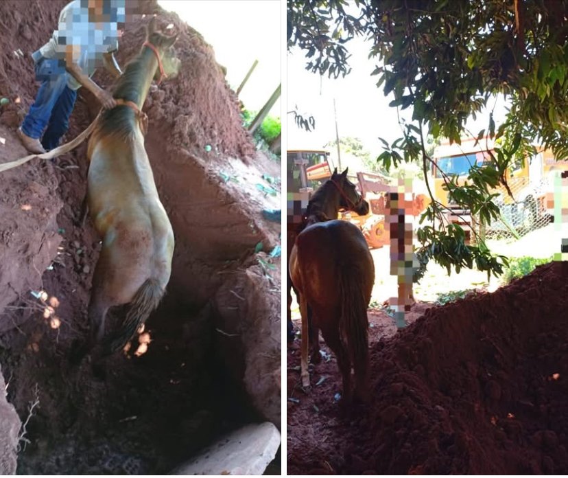 Uma égua foi resgatada com sucesso na tarde desta última quinta-feira (20), por volta das 13h20, após cair em um buraco de aproximadamente dois metros de profundidade na Rua Belo Horizonte, em Querência do Norte (PR).