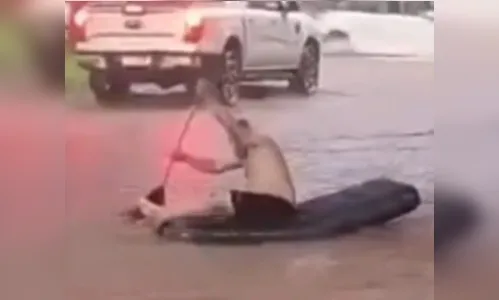 Uma forte tempestade atingiu Maringá (PR) na noite desta sexta-feira (12), provocando alagamentos, queda de árvores e transtornos em diversos bairros da cidade. Em meio ao caos urbano, uma cena inusitada ganhou repercussão nas redes sociais: um homem foi flagrado utilizando um colchão de ar para se deslocar pela enxurrada na Avenida Morangueira. Assista ao vídeo no fim da matéria.