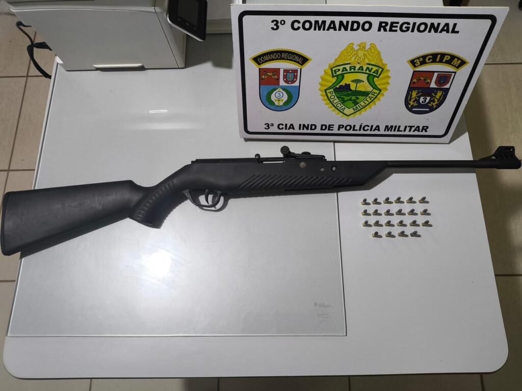 Após diligências, foi localizada uma carabina de pressão modificada para disparar munição real, além de 22 projéteis calibre .22. A arma e as munições foram apreendidas.