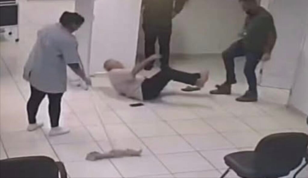 Ainda segundo o relato, durante o desentendimento, um idoso foi derrubado e agredido no chão. Na sequência, o outro idoso que era atendido foi empurrado para fora da sala, caiu e bateu a cabeça no piso.