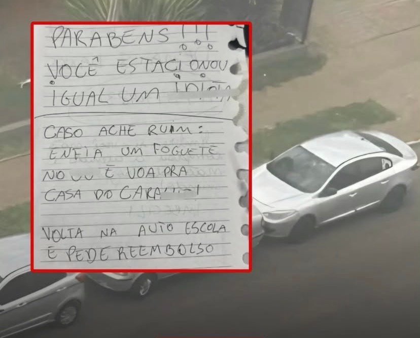 Indignado com a situação, o condutor prejudicado decidiu deixar um bilhete no para-brisa do veículo de trás — com um tom irônico e direto — criticando a forma como o carro foi estacionado.