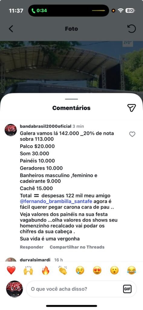 Em uma postagem nas redes sociais, o perfil oficial da Banda Brasil 2000 atacou o ex-prefeito, Fernando Brambilla e justificou o valor contratado. Veja: