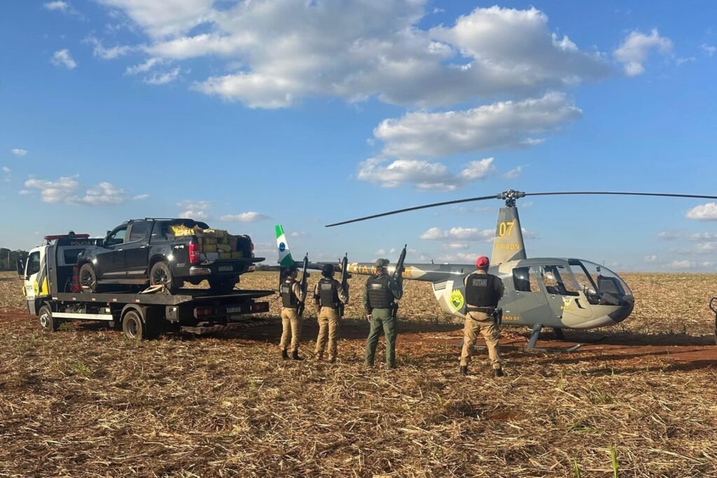 Durante as buscas em uma área de mata, os policiais localizaram uma caminhonete S10 preta carregada com tabletes de droga. A ação também teve a participação do Batalhão de Polícia Rodoviária (BPRv) e do Rádio Patrulha do 7º Batalhão.
