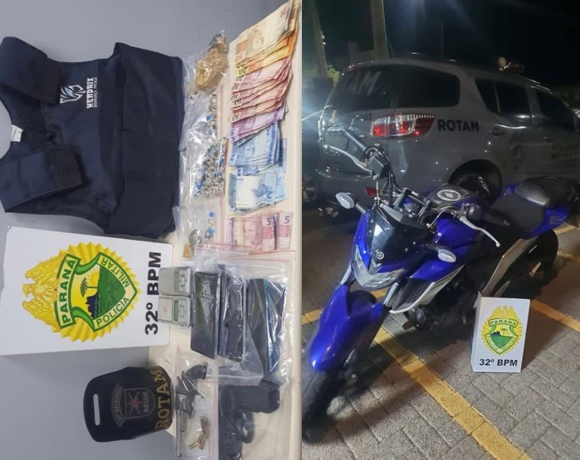 No interior da residência, a equipe encontrou aproximadamente 300 pedras de crack já fracionadas para a venda, além de um revólver calibre .32, um colete balístico e uma motocicleta Yamaha Fazer com registro de furto no município de Maringá.