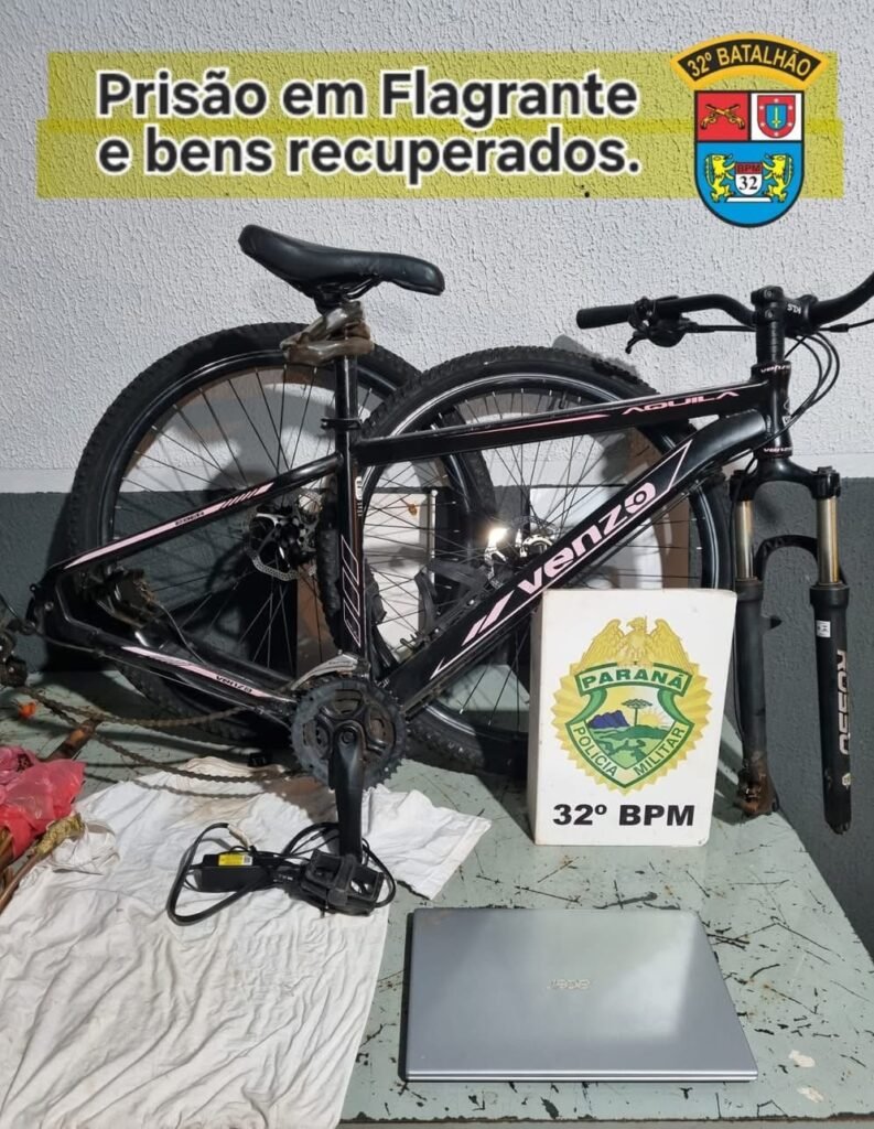 Em diligências realizadas nas imediações, os policiais localizaram os objetos furtados — uma bicicleta e um notebook. Pouco depois, o autor foi encontrado escondido em um imóvel nas proximidades e detido.