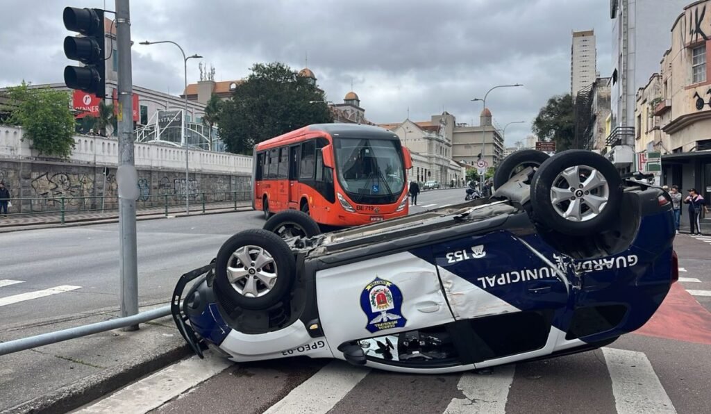 Uma viatura da Guarda Municipal capotou nesta terça-feira (3) após se envolver em um acidente com um ônibus biarticulado na Rua Sete de Setembro, próximo à Travessa da Lapa, no bairro Rebouças, em Curitiba. O coletivo realizava uma conversão para acessar a travessa em direção ao terminal Santa Cândida quando ocorreu a colisão.